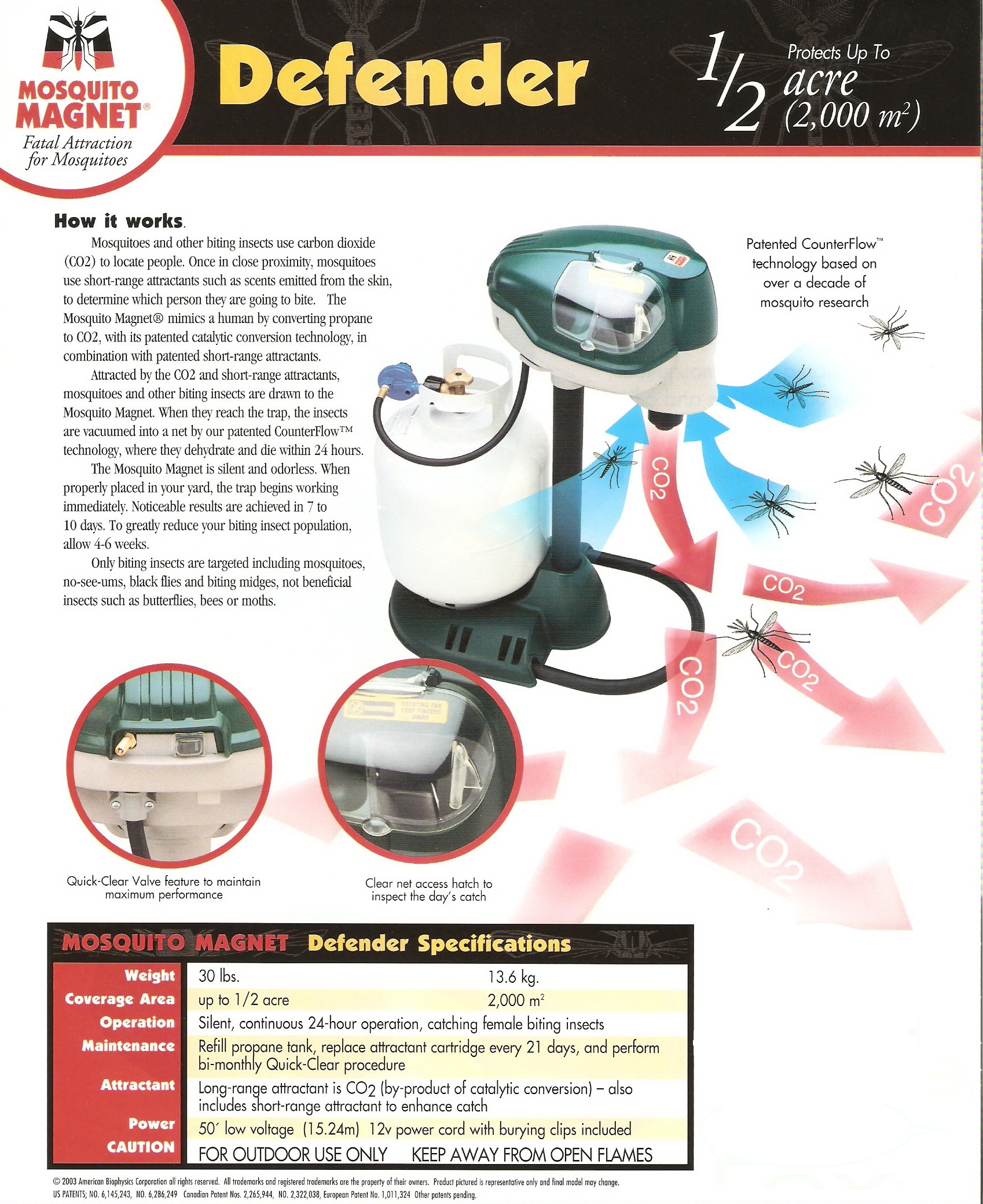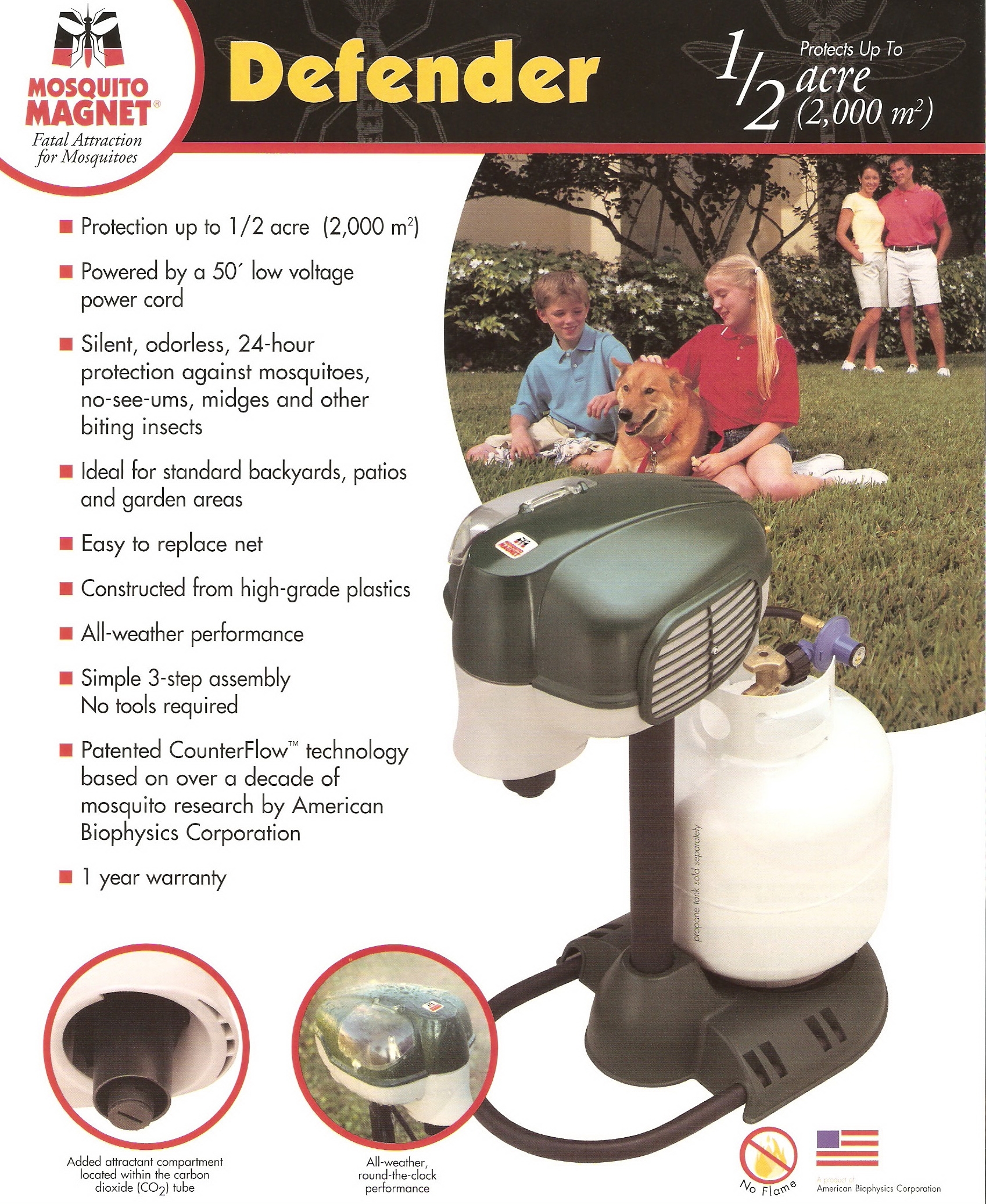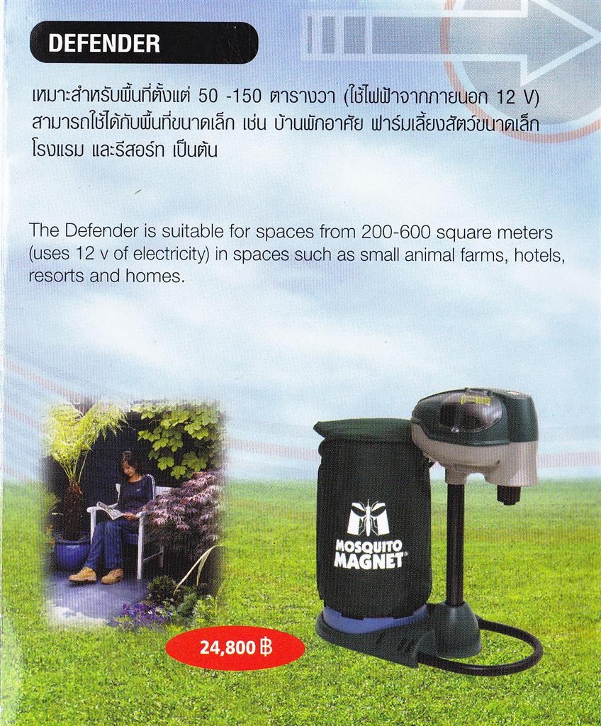- เครื่องดักจับยุง รุ่น Defender ยุง และแมลงดูดเลือดบางชนิดจะใช้กลิ่นของก๊าซคาร์บอนไดออก ไซด์เพื่อหาตำแหน่งของ เหยื่อที่อยู่ระยะไกล แต่เมื่อมันเข้ามาใกล้ๆ มันจะใช้กลิ่นที่ออกมาทางผิวหนังของเหยื่อ เพื่อตัดสินใจว่ามันควร จะกัดเหยื่อตัวไหน ... Defender วิธีการทำงานของเครื่อง ยุง และแมลงดูดเลือดบางชนิดจะใช้กลิ่นของก๊าซคาร์บอนไดออกไซด์เพื่อหาตำแหน่งของ เหยื่อที่อยู่ระยะไกล แต่เมื่อมันเข้ามาใกล้ๆมันจะใช้กลิ่นที่ออกมาทางผิวหนังของเหยื่อ เพื่อตัดสินใจว่ามันควรจะกัดเหยื่อตัวไหน สำหรับเครื่อง Mosquito Magnet จะเปลี่ยนก๊าซ Propane หรือ LPG ให้เป็นก๊าซคาร์บอนไดออกไซด์ด้วยระบบภายในห้องเครื่องซึ่งเป็นลิขสิทธิ์ เฉพาะของทางผลิตภัณฑ์เพื่อใช้ในการล่อยุงให้เข้ามาใกล้ และควบคู่ไปกับการปล่อยกลิ่นที่คล้ายกับกลิ่นที่เกิดจากผิวหนังของคนและ สัตว์ เพื่อล่อให้ยุงที่บินในระยะใกล้เข้ามาติดกับ พลังงานที่ใช้: พลังงานไฟฟ้า 12 โวลต์ การดูแลสินค้า: ทำความสะอาดถุงใส่ยุง เปลี่ยนสารล่อแมลงเมื่อหมด และเปลี่ยนถุงที่ใช้จับยุงเมื่อมีการหย่อนยาน ต้องเปลี่ยนแก๊สและสารล่อยุงทุกเดือน การรับประกัน: 1 ปี ระยะการทำงาน: 50-150ตารางวา สถานที่ติดตั้ง: ใช้ภายนอกอาคารเท่านั้น เหมาะสำหรับสวนที่มีขนาดใหญ่, สิ่งก่อสร้างที่ตั้งติดอยู่กับน้ำ และสถานที่ที่ไม่มีไฟฟ้าเข้าถึง, โรงงาน, โรงแรม, รีสอร์ท
