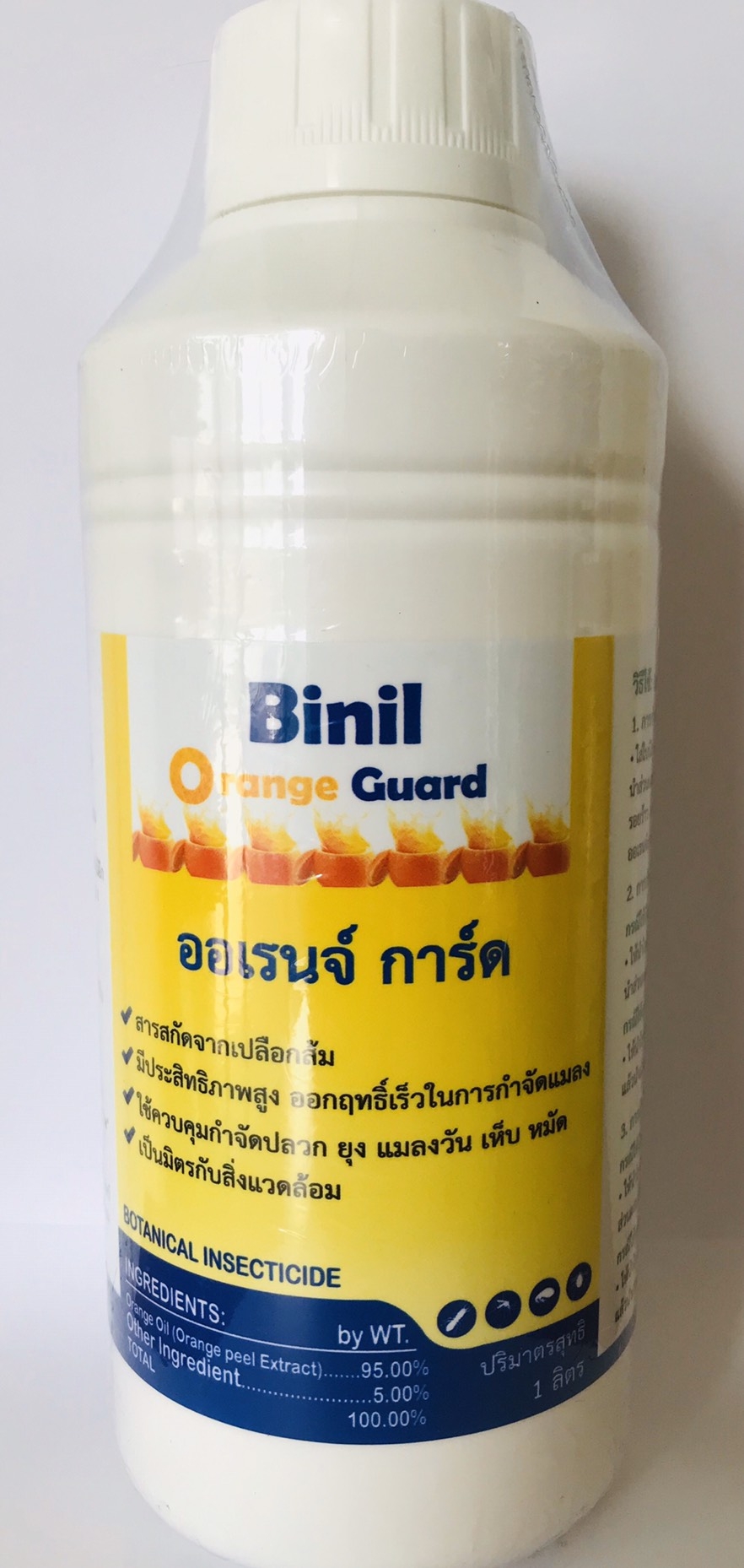 - Binil Orange Guard (ไบนิล ออเรนจ์ การ์ด) ผลิตภัณฑ์กำจัดปลวก และแมลง ขนาดบรรจุ : 1,000ml ประเภท : หัวเชื้อ สารออกฤทธิ์ : Orange Oil (d-limonene) 95% w/w Binil Orange Guard เป็นผลิตภัณฑ์สำหรับควบคุม กำจัดปลวกและแมลง เช่น มด ยุง เห็บ หมัด แมลงวัน โดยผลิตจาก Orange Oil ซึ่งสกัดจากเปลือกส้ม มีประสิทธิภาพสูงในการใช้กำจัดปลวกและแมลง ซึ่งเป็นสารสกัดที่นิยมใช้กำจัดปลวกที่สหรัฐฯ โดยสารจะออกฤทธิ์ 2 ทาง ซึ่งเมื่อปลวกและแมลงสัมผัส หรือได้รับไอระเหยจาก Orange Oil ปลวกและจะค่อยๆตาย นอกจากนี้ Orange Oil ยังมีความปลอดภัยสูง และเป็นมิตรกับสิ่งแวดล้อม โดย Binil Orange Oil สามารถใช้ฉีดพ่นได้ทั้งภายในและภายนอกที่อยู่อาศัย BOTANITCAL INSECTICIDE INGREDIEBTS: by WT. Orange Oil (Orange peel Extract) .95.00% Other Ingredient .. .5.00% TOTAL 100.00% วิธีการใช้: (เขย่าขวดก่อนใช้งานทุกครั้ง) 1. ใช้เพื่อกำจัดปลวก ใช้ไบนิล ออเรนจ์ การ์ด 1 ลิตร ผสมน้ำให้ครบ 100 ลิตร นำส่วนผสมนี้ไปฉีดพ่นลงดิน ในกรณีฉีดพ่นเข้าไปในรอยแตก หรือรอยร้าว วงกบไม้ พื้นบัวไม้ เฟอร์นิเจอร์ บิวท์อิน พื้นไม้ ให้ผสม ไบนิล ออเรนจ์ การ์ด 1 ลิตร ต่อ จากนั้นเติมน้ำให้ครบ 50 ลิตร 2. ใช้เพื่อกำจัดยุง มด เห็บ หมัด กรณีใช้ถังสเปรย์ ผสม ไบนิล ออเรนจ์ การ์ด 1 ลิตร บน้ำให้ได้ 30 ลิตร แล้วนำส่วนผสมนี้ไปฉีดพ่นบริเวณที่ถูกยุง มด เห็บ หมัดรบกวน 3. ใช้เพื่อกำจัดแมลงวัน 3.1 กรณีใช้ถังสเปรย์ ผสม ไบนิล ออเรนจ์ การ์ด 1 ลิตรกับน้ำให้ได้ 15 ลิตร แล้วนำส่วนผสมไปฉีดพ่นบริเวณที่ถูกแมลงวัน รบกวน 3.2 กรณีใช้เครื่อง ULV ฉีดพ่น ผสม ไบนิล ออเรนจ์ การ์ด 600 มิลลิลิตร กับน้ำให้ได้ 2 ลิตร แล้วนำส่วนผสมนี้ไปฉีดพ่นบริเวณที่ถูก แมลงวันรบกวน สารสำคัญในผลิตภัณฑ์นี้ได้รับยกเว้น ไม่เป็นวัตถุอันตราย (วอส.)